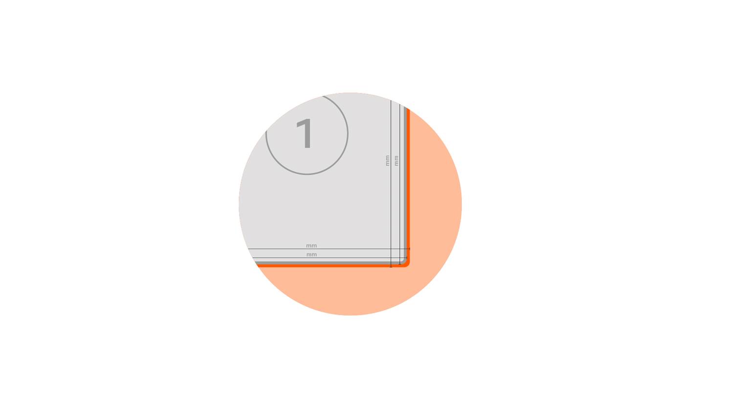 Nous vous recommandons par ailleurs de respecter un espace d’au moins 3mm, ou mieux 5mm, depuis le bord de coupe pour les éléments d’inscription et de design, afin de garantir une impression optique équilibrée (y compris fond perdu, 5 à 7mm du bord d'impression).